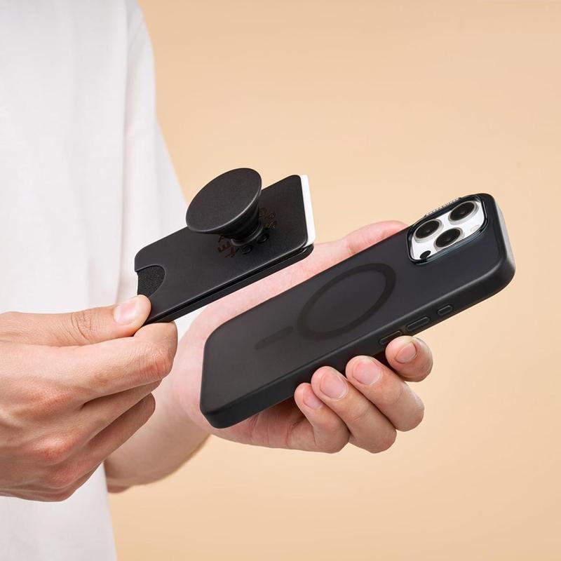 PopSockets MagSafe phone wallet in black with expanding grip, holds 3 cards, includes adapter ring for secure attachment