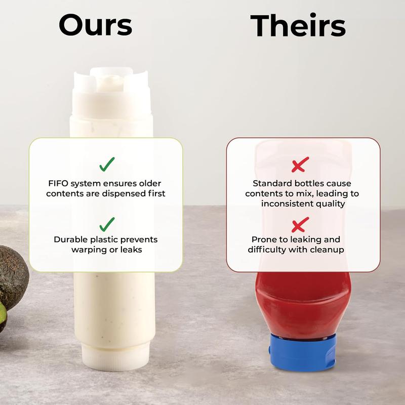 Revolutionize your condiment dispensing with the Restaurantware 16oz FIFO Inverted Plastic Squeeze Bottle featuring innovative first-in-first-out technology! This professional-grade bottle ensures freshness by dispensing from the bottom up, eliminating waste and maintaining product quality. Includes both refill and dispensing lids for versatile operation. The crystal-clear construction lets you monitor contents at a glance, while precise measurements molded into the bottle help with portion control. Perfect for sauces, dressings, oils, syrups, condiments, and marinades in restaurants, catering operations, food trucks, and home kitchens. Durable BPA-free plastic withstands commercial use and repeated washing. Wide opening makes refilling and cleaning effortless. Ideal for professional chefs, caterers, and serious home cooks demanding restaurant-quality tools!